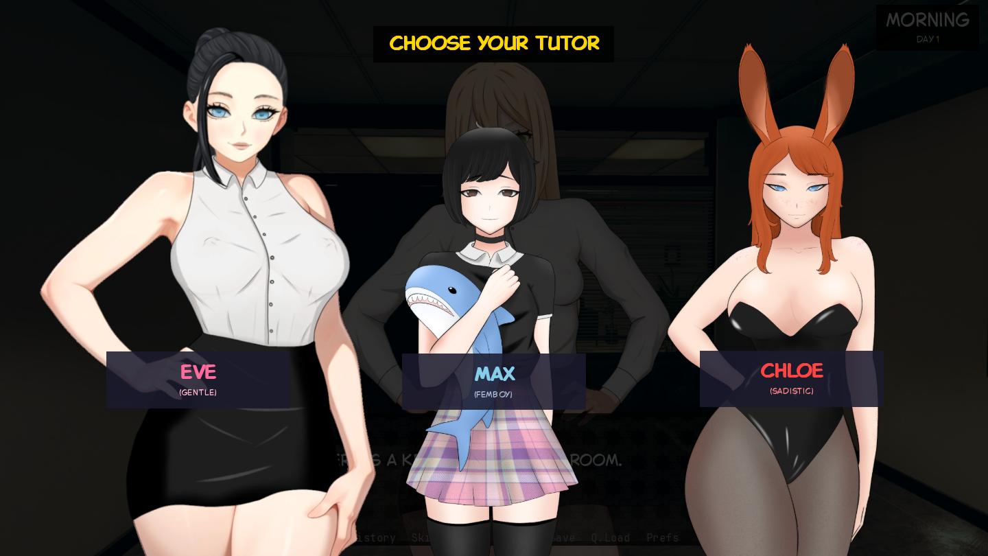 3 tutors to choose from: Max (Femboy), Eve, Chloe (Sadistic bunny)